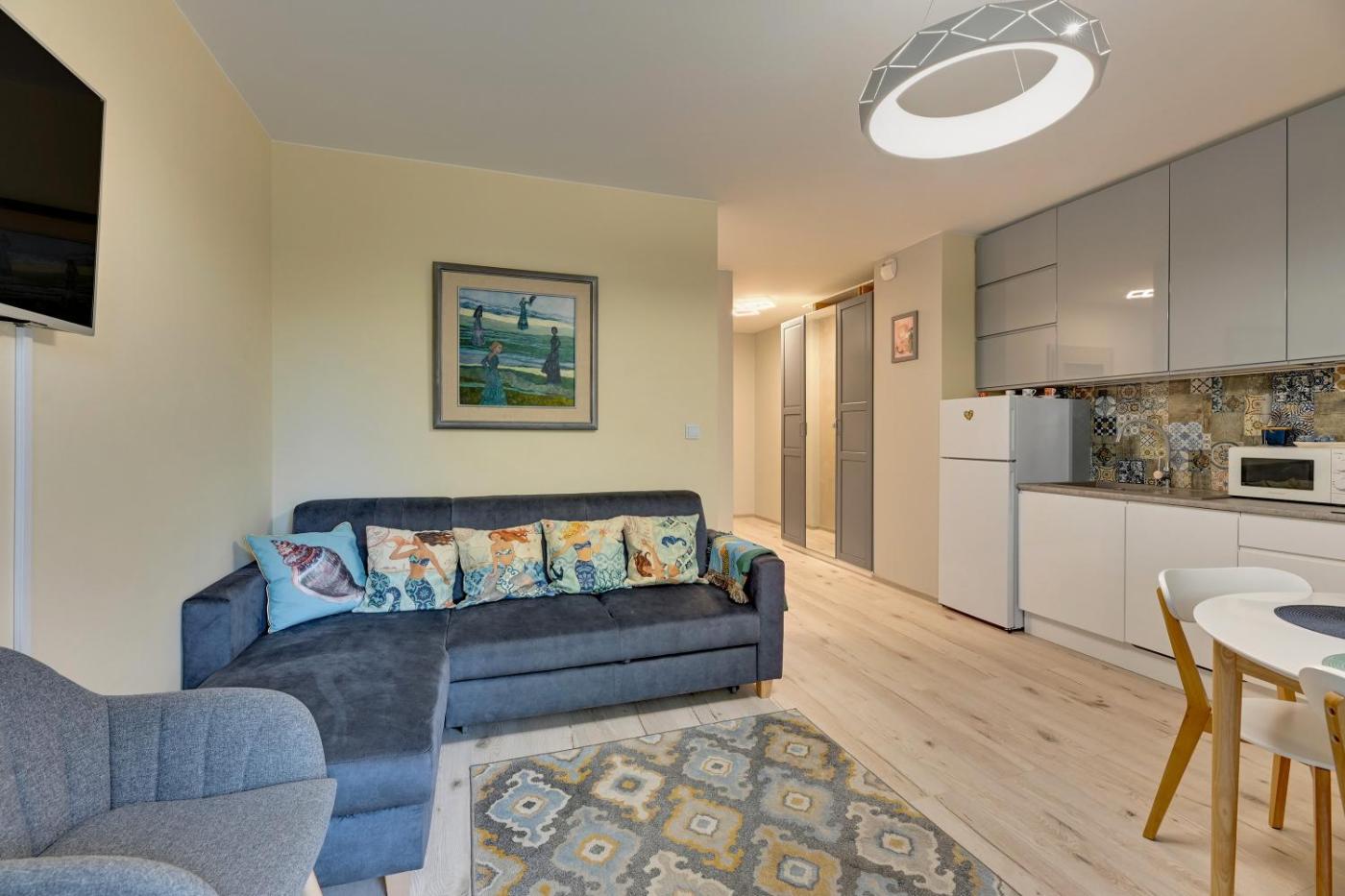 Apartament z 2 sypialniami i tarasem. This apartment consists of 1 living room, 2 separate bedrooms and 1 bathroom with a shower and a hairdryer. Meals can be prepared in the kitchenette, which is equipped with a stovetop, a refrigerator, kitchenware and a microwave. Featuring a terrace with city views, this apartment also provides a washing machine and a flat-screen TV with cable channels. The unit offers 3 beds. Apartament - 6 osobowy. Powierzchnia pokoju ok.: 60 mkw.